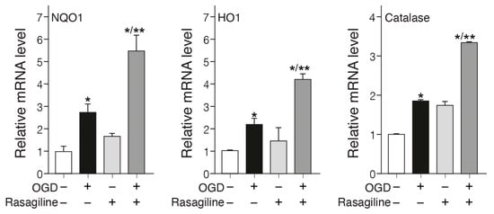 Increased levels of antioxidant enzymes such as NQO1, HO-1, catalase, etc., by the Nrf2 pathway provide a major defense against oxidative stress in Parkinson’s [44] and stroke [45]. To investigate whether rasagiline affected the expression of these antioxidant genes in PC12 cell cultures exposed to the ischemic insult, the mRNA expression levels of NQO1, HO-1, and catalase genes were determined (Figure 5). The ischemic insult increased the mRNA levels of NQO1, HO-1, and catalase by about twofold as compared to the normoxic cultures (Figure 5; p < 0.05). The increases in the mRNA levels of NQO1, HO-1, and catalase were amplified by 6.4- and 3.5-fold, respectively, upon treatment with rasagiline during the ischemic insult (Figure 5; p < 0.01), which is indicative of increased transcription of the ARE-mediated phase II detoxifying antioxidant enzyme genes.