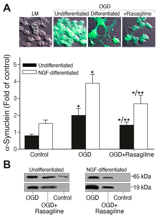 Rasagiline decreased the OGD/R-induced α-synuclein protein level. Undifferentiated (black bar) or NGF-differentiated (white bar) PC12 cell cultures were subjected to normoxia (control) or ischemic insult (OGD) in the absence or presence of 10 μM rasagiline (OGD + Rasagiline). (A) Quantitative analysis of the fluorescence intensity of cultures grown on coverslips, fixed and immunostained with anti-α-synuclein antibody (green), and analyzed by a confocal microscope. Its level was increased by the ischemic insult and reduced by rasagiline treatment. * p < 0.05 vs. control; ** p < 0.05 vs. OGD. LM—light microscopy photos of undifferentiated cells; (B) Western blotting analysis of the 19 and 65 kDa α-synuclein proteins. Their level was increased by the ischemic insult and significantly decreased in the rasagiline-treated cultures.