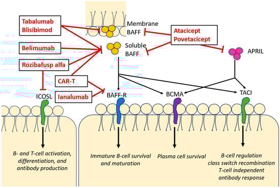 B-cell-activating factor (BAFF), also known as B Lymphocyte Stimulator (BLyS) and APRIL (a proliferation-inducing ligand), are cytokines in the tumor necrosis factor (TNF) ligand family that are widely expressed by several cell types, including hematopoietic and stromal cells. BAFF and APRIL interact with the TNF receptor family B-cell maturation antigen (BCMA and transmembrane activator and CAML interactor (TACI). In addition, BAFF interacts with BAFF-R, a receptor specific for BAFF. In humans, BAFF-R is expressed at the late transitional (T1) B-cell stage in all mature B-cells and memory B-cells and is absent in plasma cells. TACI is expressed on B-cells after the T2 stage and on plasmablasts and plasma cells, while BCMA is exclusively upregulated on plasmablasts and plasma cells. BAFF is essential for B-cell development, maturation, and survival [,]. BAFF-deficient mice have unimpaired B-cell production in the bone marrow and naive T1 transitional B-cells in the spleen but impaired subsequent stages of B-cell differentiation, including T2, mature, and marginal zone B-cells. BAFF-R-deficient mice have B-cell lymphopenia and weak high-affinity antibody responses. In humans, BAFF-R deficiency was seen in association with adult-onset immune deficiency, B-cell arrest at the transitional B-cell stage, decreased numbers of mature B-cells, including follicular, marginal zone, and memory B-cell lymphopenia, decreased serum IgG and IgM, and normal IgA serum levels and impaired T-cell-independent vaccine immune responses [].