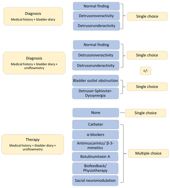 Four experienced neuro-urologists were recruited as raters. They received the following data: diagnoses of the participants, a summarised medical history, information on gender, summarised information from BDs, graphics of the UF curves with information on voided volume in ml, PVR in ml, and maximum urinary flow in ml/s. The raters were asked to assign the individual uroflowmetry findings to the most appropriate diagnostic category, considering the clinical information and the BDs, and to select a corresponding treatment recommendation. A standardised evaluation form was used for this purpose. The answering options listed in the form are shown in Figure 1. All raters were blinded to the original clinical findings.