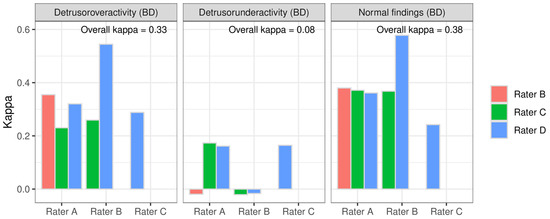 For the suspected diagnosis from medical history and BDs, the raters had 3 options: normal findings (NF), detrusor overactivity (DO) and detrusor underactivity (DU) for single selection. The paired comparisons for each singular suspected diagnosis were as follows: for NFs, κC = 0.24 to κC = 0.58; for DO, κC = 0.23 to κC = 0.54; and for DU, κC = −0.02 to κC = 0.17 (Figure 2). The paired comparison between the raters for all suspected diagnoses showed Cohens’ kappa values of 0.25 to 0.54 and thus fair-to-moderate agreement [18] (Figure 3). The results of the comparison of all raters (Fleiss’ kappa) are shown in Figure 2 and Figure 3. DU achieved the lowest IRR.