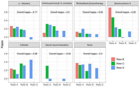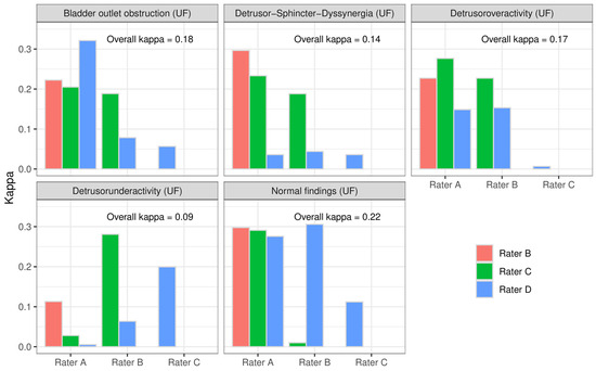 For the diagnoses from medical history, BDs, and UF, we obtained a fair agreement with kappa values of 0.32 (κC) and 0.2 (κF), respectively, for the singular consideration of the diagnoses, both between the rater pairs and in the overall rater comparison. However, many kappa values were lower, especially when combinations of diagnoses were considered. For the singular analyses of the treatment suggestions, the kappa values tended to be slightly higher. Particularly in the treatment suggestions “catheter”, “botulinum toxin” and “none”, the kappa between the rater pairs was up to 0.71 and was 0.32 in the overall comparison of all raters. When looking at treatment combinations, the IRR fell significantly to values below 0.2 for slight agreement. The fewer options were available, the higher was the raters’ agreement.