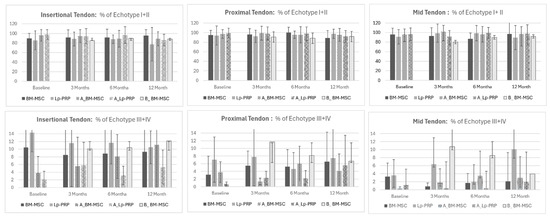 Mean percentage differences of organized tendons (echo-types I + II) and disorganized tendons (echo-types III + IV) at baseline, 3, 6, and 12 months after BM-MSC, Lp-PRP, and phase B-BM-MSC biological treatments are represented in Figure 2.