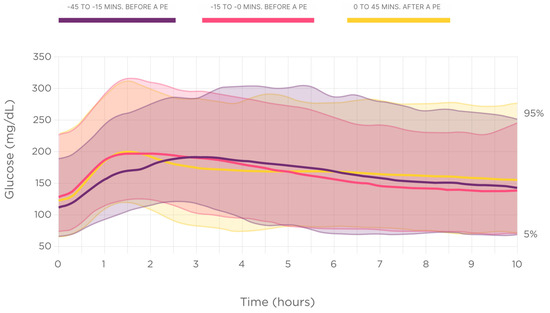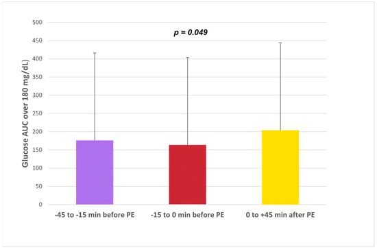 The time below the glucose range of 70 mg/dL (3.9 mmol/L) (TBR70) showed similar results (mean ± SD): −45–15 min, 4.2 ± 13.7%; −15–0 min, 3.0 ± 10.7%; 0 + 45 min, 3.4 ± 11.7% (p = 0.674).