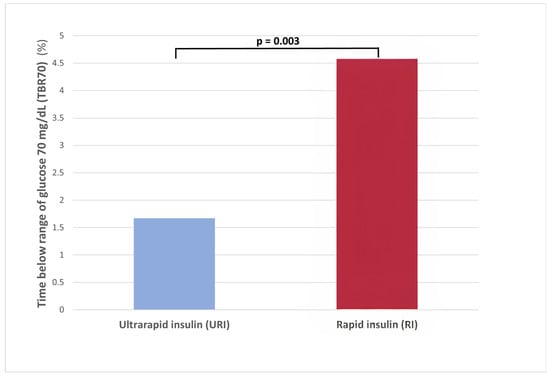 Time below the range of glucose 70 mg/dL (3.9 mmol/L) (TBR70) according to the use of ultrarapid insulin (URI) vs. rapid insulin (RI) analogs.