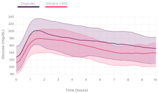 Second-generation basal insulin (BI) analogs have been developed to help people with T1D face daily challenges. These analogs, such as insulin glargine 300 U/mL (Gla-300) and insulin degludec (IDeg), have a longer and flatter profile, with less variability [16]. However, randomized clinical trials have not consistently detected significant differences between the two insulins, using the CGM methodology [17]. In an MDI regimen, the different effects on the glucose profile caused by the two basal insulins are more easily observed during the night [18].