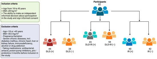 Flowchart visualizing participant recruitment. A total of 82 participants were enrolled in the study. Individuals were stratified into groups with or without dyslipidemia (DLD), insulin resistance (IR), and the combination (DLD-IR).