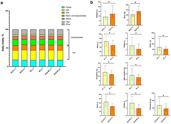 Summary of relative daily macronutrient contribution (% energy) in the study groups (a). Measured differences in daily intake (g/day) of nutrients among different groups. Data are presented as median and interquartile range (b). * p ≤ 0.05.
