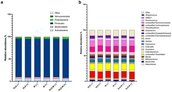 We analyzed differences in microbial community structures among study groups, measuring alpha diversity using the Chao1 and Shannon indices. There were no reliable differences in alpha diversity between groups but there was a trend toward decreased diversity in the IR (+) and DLD-IR (+) cohorts (Figure 4a,b). The Firmicutes/Bacteroidetes ratio was high in all presented groups but did not have significant differences. Beta diversity was estimated using unweighted and weighted Unifrac distances analyzed by principal coordinate analysis (PCoA). There were also no differences in beta diversity between the study groups (Figure 4c).