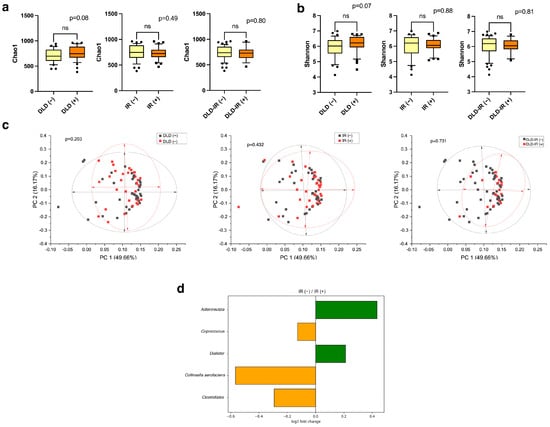 Comparative analysis of gut microbiota in the DLD (+/−), IR (+/−) and DLD-IR (+/−) groups. Alpha diversity was assessed using several metrics: Chao1 index (a), Shannon index (b) (ns: not significant). Beta diversity of bacteria identified with the principal coordinates analysis (PCoA) using Unifrac distances measures (c). To assess statistical differences between groups, a permutation test was used and log2FC was calculated. log2FC < 0 means that this taxon is more presented in IR (+) patients, log2FC > 0 means that the taxon is more presented in IR (−) patients. Significant intergroup changes were identified at the genus and species level. log2FC was calculated for each significantly different taxon (p-value < 0.05) (d).