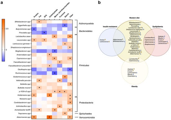 Pearson correlation between the relative abundance of gut bacteria (at the genus and species level) and dietary macronutrient intake (a). Crossover between microorganisms that have been associated with the Western-style diet, insulin resistance, dyslipidemia and obesity in this study (b). * p ≤ 0.05.