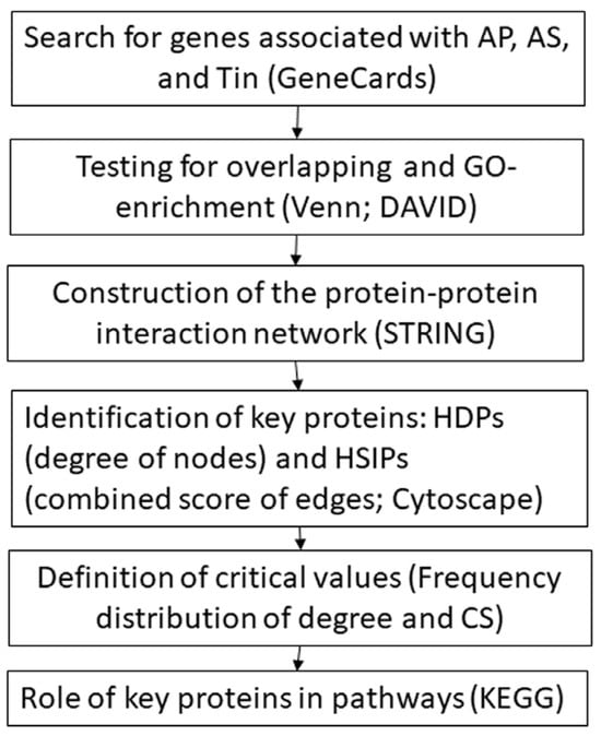 Workflow for studying the key proteins. AP—auditory perception; AS—acoustic stimulation; Tin—tinnitus; HDP—high-degree protein; HSIP—high-score interaction protein; CS—combined score.