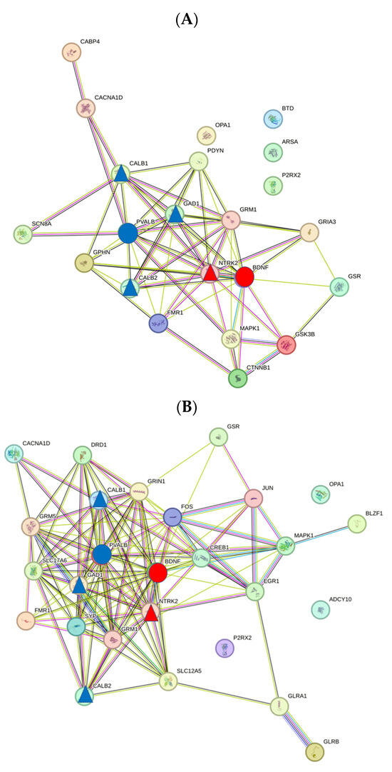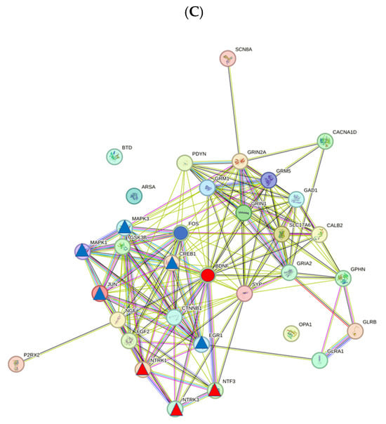 When comparing the gene lists with the PPI network, it was noticeable that the number of proteins for each network was smaller than the number of genes (Table 1). This is caused by the presence of genes in the list that only encode transcripts; for example, BDNF-AS, with a very high tinnitus score (18.2), exerts its effects via the regulatory mechanism of microRNA []. Proteins involved in specific forms of hearing disorders as a result of mutations (e.g., P2RX2) are also not part of the PPI network []. The topological parameters show only small differences between the three networks (legend of Figure 3). However, the k-mean analysis of STRING pointed to two clusters in the Tin network. Cluster 1 contained mainly proteins of glutamatergic synapses, and cluster 2 contained mainly proteins of the neurotrophin signaling pathway. It was noticeable that all key proteins were localized in cluster 2 (Figure 3; see paragraph on key proteins).