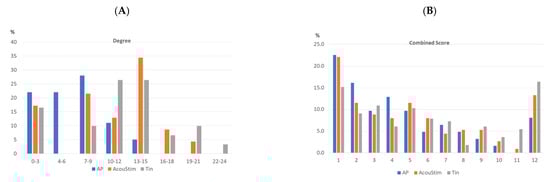 Frequency distribution of the degree (A) and CS values (B) of the AP, AcouStim, and Tin networks. The frequency distribution of the degree and CS values was calculated as the percentages of the number of nodes and edges (See legend of Figure 3). The intervals of degree values are 2, and those of CS values are 50. The CS values of class 1 correspond to CS = 400–450, and those of class 12 correspond to CS = 950–999. Characteristic values of the degree frequency curves (AP/AcouStim/Tin): Median—7/12/12; 90th percentile—12/17/19. Characteristic values of the CS frequency distribution: Median—555/598/647; 90th percentile—865/966/991.