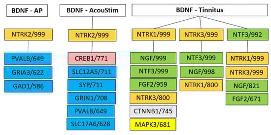 To characterize the role of the tinnitus-related top1 HDP, BDNF, in the AP, AcouStim, and Tin processes, and to identify pathways of BDNF, we searched for proteins that showed interactions with HSIPs of BDNF and thus extended the number of proteins. As a criterion for interactions of the HSIPs with other proteins, we used the value of CS >median of the frequency distribution curve (AP CS > 555, AcouStim CS > 598; Tin CS > 647). This analysis showed remarkable differences between the AP, AcouStim, and Tin processes (Figure 5). Despite the fact that the AP and AcouStim processes had identical key proteins, the proteins with which NTRK2 interacted differed significantly. In the AP process, BDNF interacted with NTRK2, PVALB, GRIA3, and GAD1. In the AcouStim process, BDNF also interacted with NTRK2, but NTRK2 interacted with several synaptic proteins. In the Tin process, BDNF interacted with NTRK1, NTRK3, and NTF3; these proteins interacted with the growth factors NGF, NTF3, and FGF2 as well as CTNNB1. Thus, NTRK2 had clearly different interaction proteins than NTRK1 or NTRK3: typical interaction proteins for NTRK2 were PVALB, GAD1, and synaptic proteins, whereas important interaction proteins for NTRK1 and NTRK3 were growth factors.