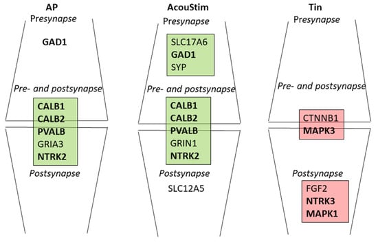 Key proteins are expressions of dominant and global processes rather than processes of single cells, single axons, or dendrites. In the present study, we identified BDNF/NTRK2 and PVALB/GAD1/CALB as top 1 and top2 key proteins in the CN. The key role of BDNF in synaptic transmission in the auditory system and the role of PVALB/GAD1/CALB in excitatory/inhibitory balance are well established [,,,,]. In tinnitus, the predominant activity is that of other proteins, namely, the top key proteins BDNF/NTRK3/NTRK1/NTF3 in interaction with a number of Top2 key proteins, all members of the IEGs. This leads to modulation of synaptic transmission and disruption of the balance between excitation and inhibition. The altered synaptic transmission is reflected in the absence of PVALB in the Tin gene list and an altered composition of synaptic proteins (Figure 6). Parvalbumin interneurons play a fundamental role in numerous neurological diseases, with a high probability of activity-regulated disinhibition or degeneration of these cells in the CN and thus the inhibitory function of these cells []. Parvalbumin interneurons are also discussed as key players in the context of the manifestation of tinnitus [].