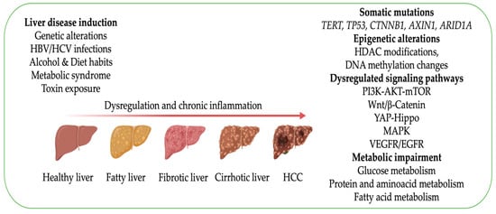 The multistep process leading to HCC development. This image was modified using the BioRender online tool (www.biorender.com, accessed on 10 June 2024). Abbreviations: HBV, hepatitis B virus; HCV, hepatitis C virus; TERT, telomerase reverse transcriptase; TP53, tumor protein 53; CTNNB1, catenin beta 1; ARID1A, AT-rich interaction domain 1A; HDAC, histone deacetylase; PI3K, phosphoinositide 3-kinase; MAPK, mitogen-activated protein kinase; VEGFR, vascular endothelial growth factor receptor; EGFR, epidermal growth factor receptor.