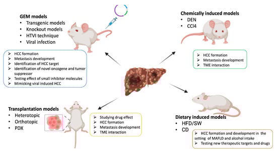 Classification and potential application of HCC mouse models. Abbreviations: CCl4, carbon tetrachloride; CD, choline-deficient; DEN, diethylnitrosamine; GEM, genetically engineered mouse; HCC, hepatocellular carcinoma; HFD, high-fat diet; HTVI, hydrodynamic tail vein injection; MAFLD, metabolic-associated fatty liver disease; PDX, patient-derived xenograft; PLC, primary liver cancer; SW, sugar water; TME, tumor microenvironment. Created with the BioRender tool (www.biorender.com, accessed on 10 June 2024).