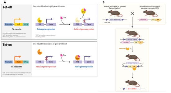 Inducible and conditional GEM models used for spatial and/or temporal control of gene expression. (A) Tetracycline (tet)-regulated expression system. Briefly, the tet transactivator acts as a constitutive repressor that is inducibly inhibited by ligands to allow expression from the tet operon (tTA). Alternatively, it functions as an inducible activator of the tet operon upon ligand addition (rtTA). (B) Tamoxifen-regulated Cre-loxP system. The Cre-lox tool is primarily used to generate knockout alleles and activate gene expression. The correct insertion of a loxP-flanked “stop” sequence (transcriptional termination element) between the promoter and transgene coding sequence hinders the expression of the gene. In the tamoxifen-inducible Cre-lox model, the system is induced upon tamoxifen administration, and the cells expressing Cre-ER undergo gene inactivation due to the Cre-mediated recombination of the loxP sites, excising the STOP codon in the reporter transgene. Provided by Biorender (www.biorender.com, accessed on 11 June 2024), modified from https://doi.org/10.3389/fphar.2019.00724.
