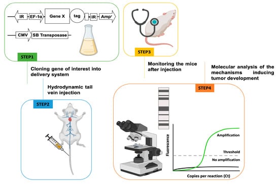 The Sleeping Beauty (SB) transposon system is a synthetic transposon designed to introduce precisely defined DNA sequences into the chromosomes of vertebrates to introduce new traits and discover new genes and their functions. Due to the system’s ability to upregulate or downregulate the levels of a gene or a group of genes, it represents the ideal platform to unravel the effect of overexpression or the inactivation of oncogenes and/or tumor suppressor genes in a given organ []. This system has been extensively used in the liver to mimic the pathophysiological and molecular features of human HCC, cholangiocarcinoma, and hepatoblastoma [,,]. Technically, hydrodynamic tail vein injection (HTVI) introduces DNA sequences into the nuclei of up to 40% of hepatocytes upon injecting a large volume of the DNA in saline or lactated Ringer’s solution into the mouse tail vein (Figure 5). Consequently, the solution is delivered rapidly, in less than 10 s, causing a transient, right-sided, venous congestion that engorges and floods the liver with fluid and mechanically disrupts cell membranes. SB has a close-to-random integration profile in the human genome, which contributes to the enhanced safety of SB []. This technology has several obvious advantages in stably expressing genes in the liver and establishing novel murine models for liver cancer compared to the traditional transgenic or knockout mouse models. For instance, the injection is performed in 6- to 8-week-old mice, thus not affecting mouse embryonic development. In addition, this technology avoids the generation of costly transgenic or knockout mice and subsequent breeding. Also, it significantly reduces the number of mice needed in the experiments due to high reproducibility. In addition, hydrodynamic transfection can be applied to mice from different genetic backgrounds. Moreover, unlike transgenic mice that express very high levels of the gene(s) of interest, the magnitude of overexpression of the transfected genes is similar to the human disease in livers subjected to HTVI. Furthermore, HTVI allows for the simultaneous injection of several genes, thus permitting the study of gene crosstalk [], and different plasmids contribute to different oncogenic-driven HCC models. Approximately 25% of HCC tumors present actionable mutations [] for known oncogenic gene-driven tumorigenesis. Hydrodynamic transfection combination with SB is an appropriate model for performing proof-of-concept studies. The main shortcoming of the transposon methodology is that it specifically targets the mature hepatocyte. Therefore, it is unsuitable for generating models originating from biliary epithelial cells or stem cells [].