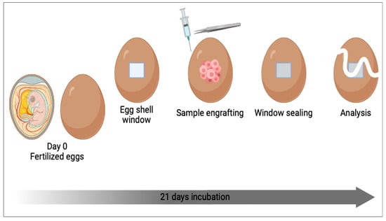The chick embryo chorioallantoic membrane (CAM) is an alternative model to overcome some common limitations encountered with the mouse models already described (Figure 6). Chick embryo development lasts 21 days, and the chorioallantoic membrane forms between days 7 and 12 []. The major advantages are that CAM is immunodeficient, highly vascularized, and non-innervated. Therefore, it is an ideal model for xenografting []. Regarding its function, CAM can be compared to the mammalian placenta and can be accessed for experimentation by partial removal of the eggshell. Furthermore, CAM expresses several extracellular proteins such as fibronectin, collagen, and laminin, making this model suitable for studying tumor invasion and metastasis. Indeed, the CAM model is a versatile tool to study angiogenesis, drug therapies, tumor development, and other research areas such as wound healing and bone tissue engineering [].