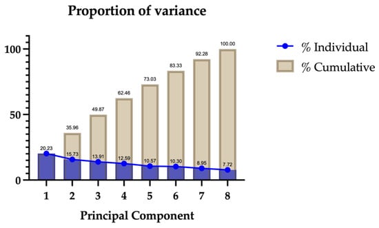 PCA results. Blue: Eigenvalues. Brown: cumulated variance. The x-axis represents the principal components, which are the new variables created from the original data. These are ordered by the amount of variance they explain, with PC1 explaining the most variance, followed by PC2, and so on. The y-axis represents the proportion of the total variance explained by each principal component. This is shown both individually (for each component) and cumulatively (accumulating the variance explained by all components up to that point). The blue line represents the eigenvalues or the proportion of variance explained by each individual principal component, while the brown bars show the cumulative proportion of variance explained by the principal components.