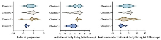 Moreover, regarding functional abilities, at the follow-up, we observed that patients belonging to Cluster 1 had higher ADL/IADL impairments, showing a statistically significant difference in the IADL score when compared with other clusters (F = 7.93, p-value < 0.001) and a statistical trend in the ADL score comparison (F = 2.33, p-value = 0.057) (see Figure 3).