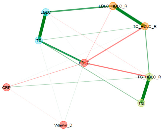 Network analysis of laboratory variables. The network nodes represent the laboratory variables, while the edges that connect the nodes represent the relationship between the variables (positive partial correlation—green color, negative partial correlation—red color). The thickness of the edges indicates the strength of the correlation. There is a positive partial correlation of HDL-C and TC with vitamin D. HDL-C was negatively correlated with CRP, TC/HDL-C (CRI I), TG/HDL-C, and LDLC/HDL-C (CRI II). A positive partial correlation was found between CRP and TC/HDL-C (CRI I), similar to that between CRP and TG/HDL-C. HDL-C and vitamin D presented a positive partial correlation, meanwhile CRP and vitamin D were negatively correlated.