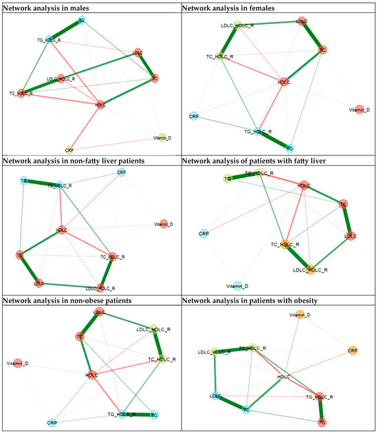 The network patterns are preserved for males and females, except for the relationship between CRP and vitamin D, which is present in male cases and absent in females. The same triangular relationship between all three—CRP, vitamin D, and HDL-C—was found with different strengths of partial correlation in obese and non-obese patients. This pattern was similar in patients with and without fatty liver (Figure 3).