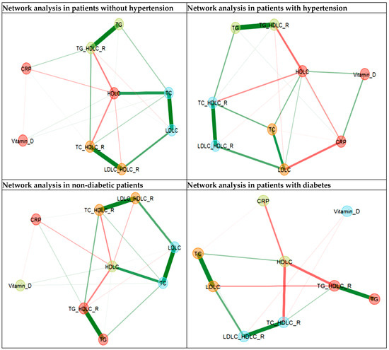 A shifted pattern was found in the network analysis of hypertensive patients. The CRP was negatively correlated with vitamin D and HDL-C, and vitamin D was positively correlated with HDL-C in non-hypertensive patients. The vitamin D and CRP relationship changed into a positive correlation, while the other remained unchanged for the hypertension group. These results should be interpreted cautiously as there is a small number of study individuals, and this specific topic may represent the subject of future studies alone.