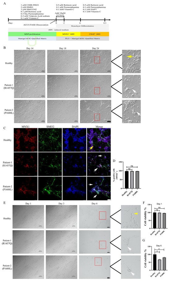 The above RNA-seq analysis results indicate that the mutation in KIF1A leads to reduced neuronal adhesion. We hypothesize that mutations in the C-terminus of KIF1A disrupt cargo transport, resulting in abnormalities in neuronal morphology. However, traditional protocols for differentiating iPSCs into motor neurons using small molecules result in neuronal growth in clusters, making it difficult to quantify and observe neuronal death and pathological changes [,,]. To address this, we adapted the protocol to generate single motor neurons (Figure 4A). The results demonstrate that with the modified motor neuron differentiation protocol, iPSCs from healthy donors can normally differentiate into motor neurons (Figure 4B). Similarly, iPSCs from ALS patients can differentiate into motor neurons with no significant difference in efficiency compared to those from healthy donors. Motor neurons from both healthy donors and ALS patients showed no difference in the ratios of MNX1+ positive neurons (Figure 4C,D). However, during single-cell differentiation of motor neurons, we observed that the density of neurons derived from ALS patients decreased compared to those from healthy donors during their differentiation from neural progenitor cells into motor neurons. (Figure 4B, day 18 and day 24), and the neurofilament morphology was noticeably abnormal (as shown by white arrow heads). The axons of mutant KIF1A MNs exhibited damaged morphologies, such as fragile axons (see SMI32, as shown by white arrow heads) (Figure 4B,C). Consequently, we used the newly adapted protocol to induce iPSC differentiation into individual motor neurons and cultured them in 96-well plates, using CCK-8 assays to evaluate cell viability. The results showed that during the differentiation process from neuronal progenitors to motor neurons, the viability of neurons from ALS patients was significantly reduced, and abnormalities in neuronal morphology were observed (Figure 4E–G).