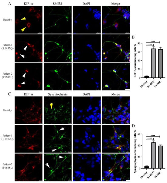 In ALS, continual neuronal death is a hallmark, driving progressive motor neuron degeneration and neurological decline []. Our established iPSC-MN model effectively recapitulates this disease phenotype. As the ALS-associated KIF1A mutant identified in this study is located at the C-terminal CC4-PH region, which is known to bind cargo [], we investigated the distribution of KIF1A in motor neurons and the abnormalities in cargo transport. Through immunofluorescence, we found that wild-type KIF1A exhibits a punctate and evenly distributed pattern in the soma and axons of motor neurons (as shown by yellow arrow heads), while the mutant KIF1A accumulates in the proximal region of the axon (as shown by white arrow heads) (Figure 5D,E). Next, we assessed the distribution of synaptophysin in neurons. As one of the cargoes transported by KIF1A and a marker of synaptic vesicles, synaptophysin is crucial for the growth, development, and survival of neurons []. The results showed that KIF1A mutations not only lead to the accumulation of KIF1A in the proximal region of the axon but also prevent the transport of synaptophysin into the axon, resulting in its accumulation in the proximal axon (Figure 5F,G). This disruption may be a critical underlying mechanism for the observed reduction in neuronal adhesion, morphological abnormalities, and neuronal death associated with KIF1A mutations.
