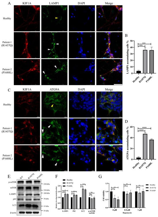 Autophagy plays a critical role in ALS by mediating the clearance of damaged proteins and organelles, potentially mitigating neuronal degeneration and death. In single motor neurons, we observed KIF1A mutant accumulation in the proximal axon. Research indicates that KIF1A is involved in the transport of lysosomes [,]. Therefore, we assessed the distribution of the KIF1A transport cargo proteins LAMP1 and ATG9A in neurons, which are lysosome-related proteins. The results showed that KIF1A mutations lead to the abnormal accumulation of LAMP1(Figure 6A,B) and ATG9A (Figure 6C,D) in the proximal axon. Western blot results indicate that KIF1A mutations, while not affecting mTOR activity, lead to abnormal accumulation of LMPA1, P62, and LC3, causing autophagy dysfunction (Figure 6E,F). The abnormal accumulation of KIF1A in the proximal region of the axon may lead to impaired cargo transport, resulting in abnormal neuronal morphology, reduced adhesion, and dysfunction of autophagy, which may be key causes of neuronal death. Interestingly, when we used the autophagy activator rapamycin during motor neuron differentiation, it was able to prevent neuronal death (Figure 6G). The activation of autophagy may play an important role in maintaining neuronal morphology and survival.