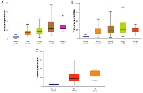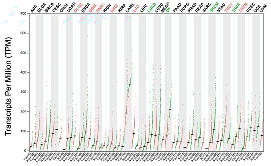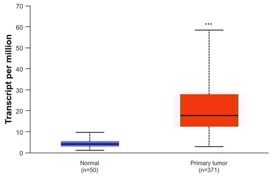 - Chandrashekar, D.S.; Karthikeyan, S.K.; Korla, P.K.; Patel, H.; Shovon, A.R.; Athar, M.; Netto, G.J.; Qin, Z.S.; Kumar, S.; Manne, U.; et al. UALCAN: An update to the integrated cancer data analysis platform. Neoplasia 2022, 25, 18–27. [Google Scholar] [CrossRef]