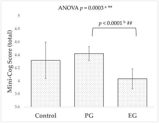 Comparisons in Mini-Cog Score between subject groups. a p-value was estimated by ANOVA. The ** indicates a significant level of less than 1% (p < 0.01). b Post hoc test was conducted using t-test. The ## denotes a significant level of 1% (p < 0.0033).