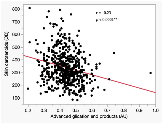 Single regression analysis of AGEs and carotenoids. The p-values are determined through this regression analysis. A ** indicates a significance level of 1% (p < 0.01).