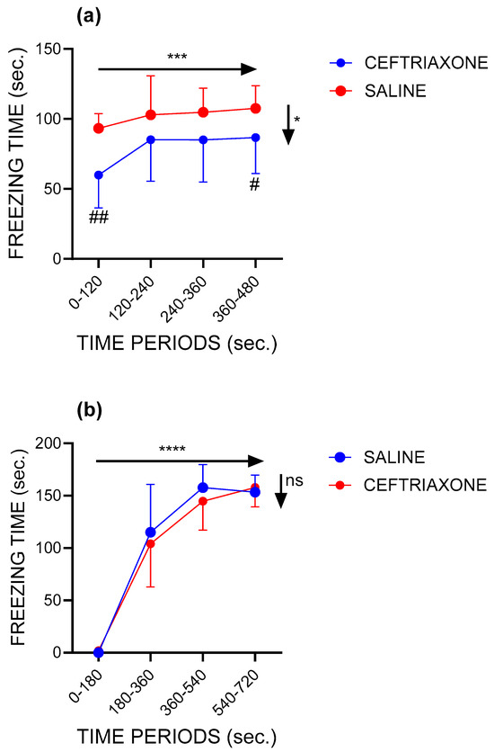 During the conditioning session (Figure 1b), the time spent in freezing behaviour was increased significantly with time (p < 0.0001; F = 205.5 for factor time in two-way RM ANOVA) in all 3 min periods for both treatments. We did not observe freezing behaviour in the initial period without applying an aversive stimulus (electroshock on feet). The exception was a single rat from the ceftriaxone group with one short freezing episode of 11 s. In the following periods, each starting with a 2 s-long electroshock applied to the feet, the time spent in freezing behaviour rapidly increased in both treatment groups, to the maximal observed values (≈160 s). This suggests a rapid and successful pairing of aversive and conditioning (the context of the ENV-001 chamber) stimuli in all rats. Tukey’s multiple comparison tests revealed significant differences between the conditioning session’s first period and all other periods (p ≤ 0.0001) for both treatments, between the second and the last periods for the saline treatment (p = 0.0410) and between the second and third periods (p = 0.0062) and second and fourth periods (p = 0.0060) for the ceftriaxone treatment. No significant differences were found regarding factor treatment during the conditioning session (p = 0.5919; F = 0.2070, two-way RM ANOVA). Also, subacute therapy with ceftriaxone applied before the conditioning session did not significantly change other fear conditioning parameters like the freezing latencies (Figure S1c: p = 0.0514, Mann–Whitney U = 18) or total freezing time (Figure S1d: p = 0.7959; Mann–Whitney U = 4).