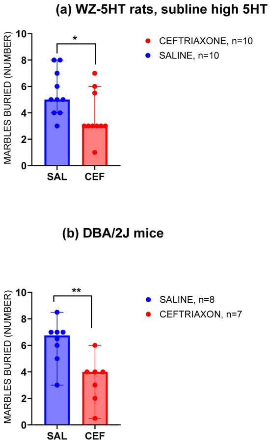 Figure 2 presents the number of glass marbles that the high-5HT subline of WZ-5HT rats (Figure 2a) and DBA2J mice (Figure 2b) buried in a cage bedding material under the influence of a subacute treatment with GLT1 enhancer ceftriaxone or saline. The WZ-5HT rats in the saline group (blue column, n = 10) buried a relatively high number of marbles (between four and eight, with five being the most frequent result). In the group of WZ-5HT rats treated with GLT1 enhancer ceftriaxone (red column, n = 10), the range of buried marbles was narrower (five rats buried only three marbles, and none buried a maximum of eight marbles). The subacute treatment with the GLT1 enhancer ceftriaxone significantly reduced compulsive-like digging behaviour compared to the control (the median for ceftriaxone = three and for the control/saline = five; p = 0.0262, Mann–Whitney U = 21.50). We also investigated the effect of subacute treatment with the GLT1 enhancer ceftriaxone or saline in a marble-burying test using 15 DBA2/J mice (Figure 2b). Similar to the experiment with the rats, subacute intraperitoneal treatment with 200 mg/kg ceftriaxone decreased the number of marbles buried in the bedding material from 6.75 (median value) for the control to 4.00 (median value) for the ceftriaxone treatment. The Mann–Whitney test revealed a significant reduction in repetitive digging behaviour with the ceftriaxone treatment compared to the control (p = 0.0076; Mann–Whitney U = 6).