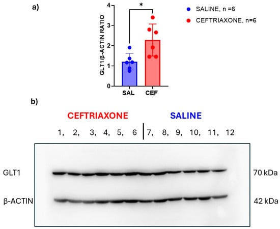 Figure 3 shows scans of immunoblots for GLT1 transporter protein (70 kDa, upper panel) and β-actin (42 kDa, lower panel) as a loading control. The immunoblots were obtained from the amygdala region of the high-5HT rats from the WZ-5HT model. For the Western blot, we used the same animals (six from each treatment group) that we used in our behavioural study described above. Bands 1 to 6 made from the amygdala region of rats treated subacutely with ceftriaxone (n = 6) were thicker than bands 7–12 in the same brain region of those treated with saline (n = 6). The GLT1/β-actin ratio (Figure 3a) calculated from the image analysis of these immunoblots with ImageJ software confirms that the intensity of the immunoblot signals significantly increased in a group of the rats treated with ceftriaxone (p = 0.0148; t = 2.939, unpaired t-test). These results suggest that subacute treatment with ceftriaxone enhances the expression of the GLT1 transporter in the amygdala region of high-5HT WZ-5HT rats, which is essential for fear and anxiety.