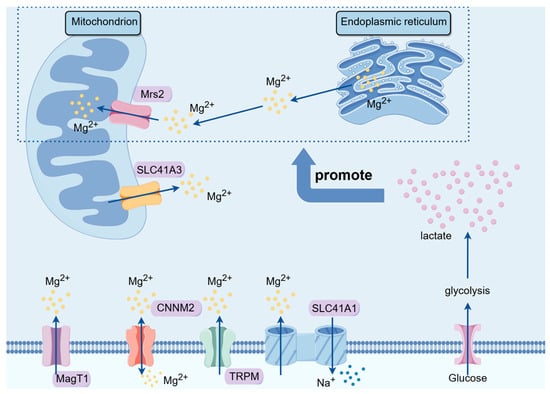 The intracellular magnesium ion distribution is regulated primarily by various magnesium ion transporter families. Mrs2 and solute carrier family 41 member A3 (SLC41A3) are the main magnesium transporters on the mitochondrial membrane. In 2016, Mastrototaro et al. [62] first observed that the overexpression of SLC41A3 in human embryonic kidney 293 (HEK293) cells led to a 60% increase in mitochondrial magnesium ion efflux compared to that in normal cells. SLC41A3 functions as a Na+/Mg2+ exchanger, and the efflux of magnesium ions depends not only on the sodium ion concentration but also on temperature. At a temperature of 16 °C, the ion flow nearly disappears [62]. Moreover, overexpression of SLC41A3 may deplete mitochondrial magnesium ions, thereby impairing cellular respiration and reducing mitochondrial ATP production [63]. The endoplasmic reticulum and mitochondria are important storage sites for magnesium ions within cells, and another mitochondrial magnesium ion transporter, Mrs2, acts as a messenger facilitating magnesium ion transfer between these two organelles. Under lactate stimulation, Mrs2 can transport magnesium ions from the endoplasmic reticulum to the mitochondria, further stimulating mitochondrial ROS production [41].