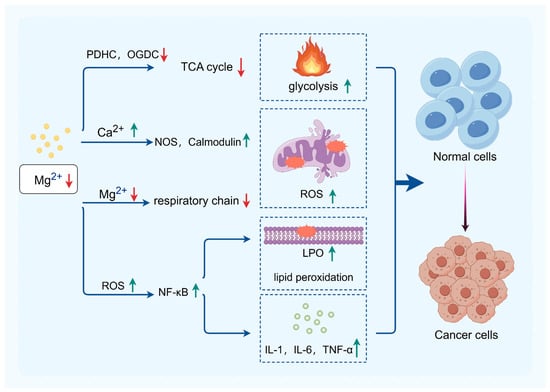The relationship between low-magnesium ions and cancers. Magnesium deficiency will affect the tricarboxylic acid (TCA) cycle, promoting lactate accumulation. It also leads to elevated calcium ions, which enhances oxidative stress. The production of ROS will further upregulate NF-κB, stimulating the production of inflammatory factors and lipid peroxidation. These effects may potentially lead to tumorigenesis. Green arrows indicate a increase in the substance content, while red arrows indicate an decrease in the substance content.
