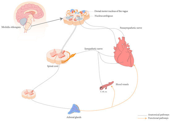 The neuroanatomical pathway from the heart to the brain primarily involves a complex network of the autonomic and CNS [35]. The ANS, comprising the sympathetic and parasympathetic nerves, is interconnected with surrounding organs and plays a regulatory role in various systems such as the cardiovascular, respiratory, digestive, and endocrine systems [37]. Sympathetic afferent fibers carry signals from baroreceptors and chemoreceptors in the heart through the cardiac plexus to the sympathetic chain ganglia, entering the spinal cord via thoracic spinal nerves (T1–T5). These fibers first pass through the dorsal root ganglia, which are located on the dorsal roots just outside the spinal cord. The fibers then proceed through the dorsal roots into the spinal cord, ultimately reaching the dorsal horn where they synapse with secondary neurons. The signals are then propagated along the spinal cord to the nucleus tractus solitarius (NTS) in the medulla oblongata [35,38]. Afferent signals from sensory receptors in the heart are transmitted via the afferent fibers of the vagus nerve, the tenth cranial nerve, which is a major component of the parasympathetic nervous system. These signals arise from the intrinsic plexuses within the cardiac branches of the vagus nerve, travel through the main trunk of the vagus nerve, and ascend through the thoracic cavity into the cervical region. In the cervical region, the signals pass through the vagal ganglia, including the jugular ganglion and the nodose ganglion, before continuing upward into the cranial cavity. Upon reaching the medulla oblongata, these afferent fibers enter the dorsal motor nucleus of the vagus and the nucleus ambiguus, both of which are critical parasympathetic nuclei, where they integrate and relay signals. Finally, the fibers terminate at the NTS [38,39]. The NTS acts as a relay station for the interoceptive ascending pathway [38,39]. Within the NTS, sensory information is integrated and processed before being transmitted to other brainstem nuclei and the cerebral cortex, facilitating regulation at both the ANS level and the level of conscious perception [35] (See Figure 1).