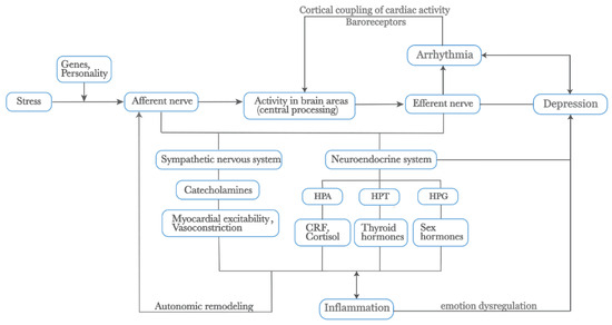 External stress mediates depression and arrhythmia by affecting physiological changes within the body. Additionally, the activation of the SNS releases catecholamines, increasing myocardial excitability and vasoconstriction. Prolonged physiological changes lead to autonomic remodeling. The neuroendocrine system, closely linked with the ANS, including the HPA, HPT, and HPG axes, releases CRF, cortisol, thyroid hormones, and sex hormones, all of which play roles in the heart–brain relationship. The SNS and HPA axis also promote inflammatory responses, which interact to mediate emotional dysregulation. Furthermore, the cortical coupling of cardiac activity through baroreceptors is crucial in these processes. Genes and personality traits also play significant roles in this pathway. Abbreviations: SNS: Sympathetic Nervous System, ANS: Autonomic Nervous System, HPA: Hypothalamic-Pituitary-Adrenal, HPT: Hypothalamic-Pituitary-Thyroid, HPG: Hypothalamic-Pituitary-Gonadal, CRF: Corticotropin-Releasing Factor.