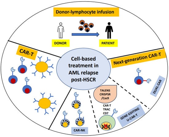 Canichella, M.; de Fabritiis, P. Cell-Based Treatment in Acute Myeloid Leukemia Relapsed after Allogeneic Stem Cell Transplantation. Biomedicines 2024, 12, 1721. https://doi.org/10.3390/biomedicines12081721