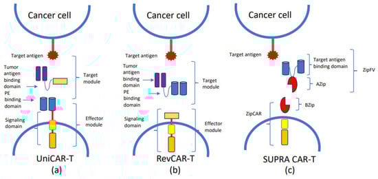 - Bachmann, M. The UniCAR system: A modular CAR T cell approach to improve the safety of CAR T cells. Immunol. Lett. 2019, 211, 13–22. [Google Scholar] [CrossRef]