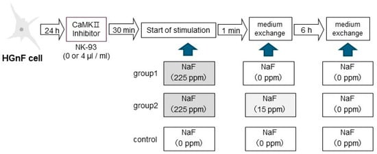 Based on the data from previous studies, the fibroblasts were exposed to a medium containing 225 ppmF NaF for 1 min, followed by replacement with a medium containing either a reduced NaF concentration (15 ppmF) for continuous stimulation (Group 2) or a medium without NaF for transient stimulation (Group 1).