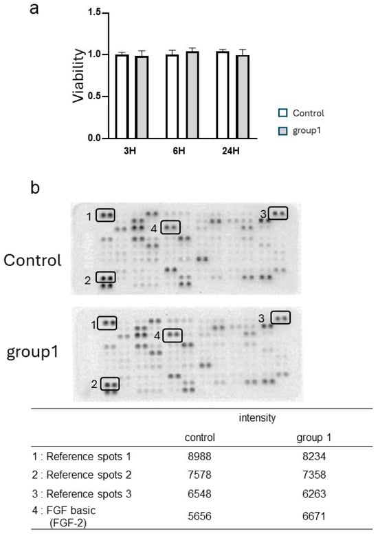 HGnFs were subjected to stimulation with 225 ppmF NaF for 1 min, and subsequent measurements of cell viability were conducted using the Cell Counting Kit-8 assay at 3, 6, and 24 h post-stimulation. Remarkably, no significant impact on cell viability was discernible (Figure 2a), thereby affirming the appropriateness of the NaF stimulation concentration. Following this validation, the expression of cytokines in the cell-culture supernatant at the 24 h mark post-stimulation with 225 ppmF NaF was scrutinized using The Proteome Profiler Human XL Cytokine Array Kit. Notably, spots indicative of FGF-2 expression exhibited enhancement upon stimulation with 225 ppmF NaF compared to the control (Figure 2b); this finding was duly substantiated by quantification utilizing Image J software https://www-p.sci.ocha.ac.jp/ohganelab/2022/08/08/imagej (accessed on 26 July 2024).