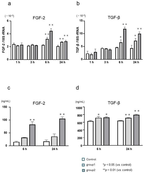 The mRNA and protein levels of FGF-2 and TGF-β in cells stimulated with 225 ppmF NaF were examined at 1, 3, 6, and 24 h post-stimulation using real-time PCR (Figure 3a,b) and ELISA (Figure 3c,d), respectively. After 6 and 24 h of culture, FGF-2 gene expression increased in cells subjected to short-term (Group 1) and continuous (Group 2) stimulation with NaF compared with unstimulated control cells, with a significant difference being observed especially in Group 2. TGF-β gene expression also showed a significant difference compared to controls in both Groups 1 and 2. FGF-2 and TGF-β protein levels were significantly higher in both Groups 1 and 2 compared to controls.