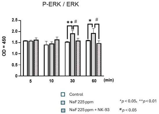 ERK1/2 phosphorylation exhibited a notable increase at both 30 and 60 min following NaF treatment. Intriguingly, the administration of NK93, which is known to be a CaMKII inhibitor, resulted in the complete blockade of the NaF-induced stimulatory effects on ERK1/2 phosphorylation at the 30 and 60 min time points (Figure 5).
