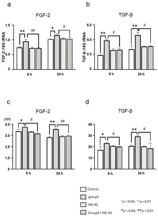 NK93 effectively suppressed the stimulatory effect induced by NaF on the expression of FGF-2 and TGF-β mRNA (Figure 6a,b). Moreover, NK93 exhibited a complete inhibition of the stimulatory effect of NaF on the expression of FGF-2 and TGF-β proteins (Figure 6c,d).